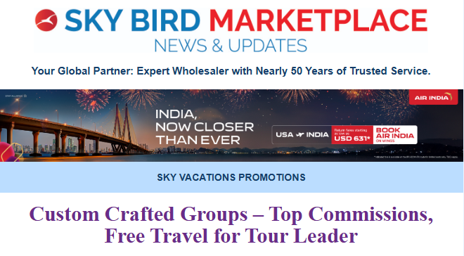 Promotions Current Sky Bird News and Updates Learn More Our Tours Division, Sky Vacations, Has Been Nominated! Learn More Simplify Group Bookings with Sky Bird Travel Learn More NDC content now available on WINGS Learn More Group Health and Other Benefits Survey Learn More Past Sky Bird News and Updates Learn More Sky Bird News and Updates Learn More Sky Bird News and Updates Learn More Sky Bird News and Updates Learn More Sky Bird News and Updates Learn More Sky Bird News and Updates Learn More Sky Bird News and Updates Learn More Sky Bird News and Updates Learn More Sky Bird News and Updates Learn More Sky Bird News and Updates Learn More Sky Bird News and Updates Learn More Sky Bird News and Updates Learn More Sky Bird News and Updates Learn More Sky Bird News and Updates Learn More Sky Bird News and Updates Learn More Sky Bird News and Updates Learn More Sky Bird News and Updates Learn More Sky Bird News and Updates Learn More Sky Bird News and Updates Learn More Sky Bird News and Updates Learn More Sky Bird News and Updates Learn More Sky Bird News and Updates Learn More Sky Bird News and Updates Learn More Sky Bird News and Updates Learn More Sky Bird News and Updates Learn More Coffee Talks with Sky Bird Learn More Sky Bird News and Updates Learn More Sky Bird News and Updates Learn More Sky Bird News and Updates Learn More Sky Bird News and Updates Learn More Sky Bird News and Updates Learn More Sky Bird News and Updates Learn More Sky Bird News and Updates Learn More Sky Bird News and Updates Learn More Sky Bird News and Updates Learn More Gain an edge with NDC content on WINGS Learn More Sky Vacations - Your Partner for Custom-Crafted FIT Learn More Happy Holidays from Sky Bird! Learn More Sky Bird News and Updates Learn More Sky Bird News and Updates Learn More Sky Bird News and Updates Learn More Sky Bird News and Updates Learn More Sky Bird News and Updates Learn More Sky Bird News and Updates Learn More Sky Bird News and Updates Learn More Sky Bird News and Updates Learn More Sky Bird News and Updates Learn More Sky Bird News and Updates Learn More Sky Bird News and Updates Learn More More Gateways, More Adventures with Air India Learn More Earn More Commission on Published Fares to Western Europe! Learn More RCA 2024 Readers' Choice Awards Learn More Sky Bird News and Updates Learn More Sky Bird News and Updates Learn More Sky Bird News and Updates Learn More Sky Bird News and Updates Learn More Sky Bird News and Updates Learn More Sky Bird News and Updates Learn More Sky Bird News and Updates Learn More Sky Bird News and Updates Learn More Sky Bird News and Updates Learn More Sky Bird News and Updates Learn More Sky Bird News and Updates Learn More Sky Bird News and Updates Learn More Sky Bird News and Updates Learn More Sky Bird News and Updates Learn More Sky Bird News and Updates Learn More Sky Bird News and Updates Learn More Sky Bird News and Updates Learn More Chance to WIN: All-Inclusive Getaway or $5000 USD Learn More Great Connections & Non-Stop Flights via LOT Polish Airlines Learn More Qatar Airways CA Stopover Hotel Deals Learn More Book More, Earn More with Condor Airlines! Learn More New Flight Routes from Etihad Airways Learn More Sky Bird News and Updates Learn More Sky Bird News and Updates Learn More Sky Bird News and Updates Learn More Sky Bird News and Updates Learn More Sky Bird News and Updates Learn More Sky Bird News and Updates Learn More Sky Bird News and Updates Learn More Sky Bird News and Updates Learn More Book Singapore Airlines NDC Special Fares Through WINGS Learn More Book Singapore Airlines Special Deals for a Limited Time Learn More Fiji & Pacific Islands round trip via Fiji Airways Learn More Treat Clients To The World’s Best Business Class Learn More Sign Up for ACH Direct Deposit Payments Learn More Frankfurt Promotion with Condor Airlines from any North American Gateway Learn More Sell LATAM NDC, Earn A $100 Gift Card Learn More Book Singapore Airline Special Deals For a Limited Time Learn More Book Singapore Airlines' NDC Special Fares through WINGS Learn More Experience the difference with LOT Polish Airlines Learn More Turkish Airlines is launching a new non-stop route from Detroit - Istanbul starting November 15th Learn More Non-stop flights from Fort Lauderdale - Israel Learn More Enjoy 15% commission and $5 USD cashback for every pre-paid hotel booking! Learn More Earn 15% commission and $5 USD cashback on prepaid hotels Learn More LIVE WINGS Webinar on August 10th at 2 pm EST and 7 pm EST Learn More Learn how to maximize commission, maintain client satisfaction, and book travel necessities! Learn More Book Low Fares To Frankfurt On Condor Airlines! Learn More Book and Earn 12%+ in commission Learn More Earn 15% Comission on prepaid hotels Learn More Book the new route from NEOS Airlines on WINGS! Learn More Find the best hotel for your client's vacation this summer while you earn commission! Learn More Luxury Boutique Hotels | Resorts | Villas Learn More VoteSky Bird Travel & Tours Best Airline Consolidator Learn More Start July with a bang with one of our two live webinars! Learn More Find the best hotel for your client's vacation this summer while you earn commission! Learn More Ask us how to make 15% commission Learn More Ask us how to make 15% commission Learn More Learn about network & service updates, luxury travel options, sustainability practices, & more! Learn More Booking large groups just got better! Learn More Show All Past PromotionsClose All Past Promotions