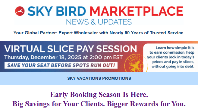 Promotions Current Sky Bird News and Updates Learn More Sky Bird News and Updates Learn More Our Tours Division, Sky Vacations, Has Been Nominated! Learn More Simplify Group Bookings with Sky Bird Travel Learn More NDC content now available on WINGS Learn More Group Health and Other Benefits Survey Learn More Past Sky Bird News and Updates Learn More Sky Bird News and Updates Learn More Sky Bird News and Updates Learn More Sky Bird News and Updates Learn More Sky Bird News and Updates Learn More Sky Bird News and Updates Learn More Sky Bird News and Updates Learn More Sky Bird News and Updates Learn More Sky Bird News and Updates Learn More Sky Bird News and Updates Learn More Sky Bird News and Updates Learn More Sky Bird News and Updates Learn More Sky Bird News and Updates Learn More Sky Bird News and Updates Learn More Sky Bird News and Updates Learn More Sky Bird News and Updates Learn More Sky Bird News and Updates Learn More Sky Bird News and Updates Learn More Sky Bird News and Updates Learn More Sky Bird News and Updates Learn More Sky Bird News and Updates Learn More Sky Bird News and Updates Learn More Sky Bird News and Updates Learn More Sky Bird News and Updates Learn More Sky Bird News and Updates Learn More Sky Bird News and Updates Learn More Sky Bird News and Updates Learn More Sky Bird News and Updates Learn More Coffee Talks with Sky Bird Learn More Sky Bird News and Updates Learn More Sky Bird News and Updates Learn More Sky Bird News and Updates Learn More Sky Bird News and Updates Learn More Sky Bird News and Updates Learn More Sky Bird News and Updates Learn More Sky Bird News and Updates Learn More Sky Bird News and Updates Learn More Sky Bird News and Updates Learn More Gain an edge with NDC content on WINGS Learn More Sky Vacations - Your Partner for Custom-Crafted FIT Learn More Happy Holidays from Sky Bird! Learn More Sky Bird News and Updates Learn More Sky Bird News and Updates Learn More Sky Bird News and Updates Learn More Sky Bird News and Updates Learn More Sky Bird News and Updates Learn More Sky Bird News and Updates Learn More Sky Bird News and Updates Learn More Sky Bird News and Updates Learn More Sky Bird News and Updates Learn More Sky Bird News and Updates Learn More Sky Bird News and Updates Learn More More Gateways, More Adventures with Air India Learn More Earn More Commission on Published Fares to Western Europe! Learn More RCA 2024 Readers' Choice Awards Learn More Sky Bird News and Updates Learn More Sky Bird News and Updates Learn More Sky Bird News and Updates Learn More Sky Bird News and Updates Learn More Sky Bird News and Updates Learn More Sky Bird News and Updates Learn More Sky Bird News and Updates Learn More Sky Bird News and Updates Learn More Sky Bird News and Updates Learn More Sky Bird News and Updates Learn More Sky Bird News and Updates Learn More Sky Bird News and Updates Learn More Sky Bird News and Updates Learn More Sky Bird News and Updates Learn More Sky Bird News and Updates Learn More Sky Bird News and Updates Learn More Sky Bird News and Updates Learn More Chance to WIN: All-Inclusive Getaway or $5000 USD Learn More Great Connections & Non-Stop Flights via LOT Polish Airlines Learn More Qatar Airways CA Stopover Hotel Deals Learn More Book More, Earn More with Condor Airlines! Learn More New Flight Routes from Etihad Airways Learn More Sky Bird News and Updates Learn More Sky Bird News and Updates Learn More Sky Bird News and Updates Learn More Sky Bird News and Updates Learn More Sky Bird News and Updates Learn More Sky Bird News and Updates Learn More Sky Bird News and Updates Learn More Sky Bird News and Updates Learn More Book Singapore Airlines NDC Special Fares Through WINGS Learn More Book Singapore Airlines Special Deals for a Limited Time Learn More Fiji & Pacific Islands round trip via Fiji Airways Learn More Treat Clients To The World’s Best Business Class Learn More Sign Up for ACH Direct Deposit Payments Learn More Frankfurt Promotion with Condor Airlines from any North American Gateway Learn More Sell LATAM NDC, Earn A $100 Gift Card Learn More Book Singapore Airline Special Deals For a Limited Time Learn More Book Singapore Airlines' NDC Special Fares through WINGS Learn More Experience the difference with LOT Polish Airlines Learn More Turkish Airlines is launching a new non-stop route from Detroit - Istanbul starting November 15th Learn More Non-stop flights from Fort Lauderdale - Israel Learn More Enjoy 15% commission and $5 USD cashback for every pre-paid hotel booking! Learn More Earn 15% commission and $5 USD cashback on prepaid hotels Learn More LIVE WINGS Webinar on August 10th at 2 pm EST and 7 pm EST Learn More Learn how to maximize commission, maintain client satisfaction, and book travel necessities! Learn More Book Low Fares To Frankfurt On Condor Airlines! Learn More Book and Earn 12%+ in commission Learn More Earn 15% Comission on prepaid hotels Learn More Book the new route from NEOS Airlines on WINGS! Learn More Find the best hotel for your client's vacation this summer while you earn commission! Learn More Luxury Boutique Hotels | Resorts | Villas Learn More VoteSky Bird Travel & Tours Best Airline Consolidator Learn More Start July with a bang with one of our two live webinars! Learn More Find the best hotel for your client's vacation this summer while you earn commission! Learn More Ask us how to make 15% commission Learn More Ask us how to make 15% commission Learn More Learn about network & service updates, luxury travel options, sustainability practices, & more! Learn More Booking large groups just got better! Learn More Show All Past PromotionsClose All Past Promotions